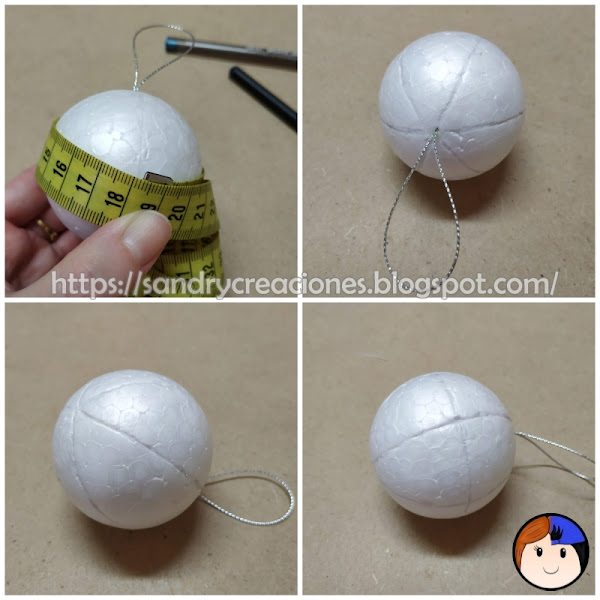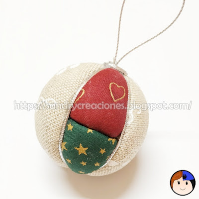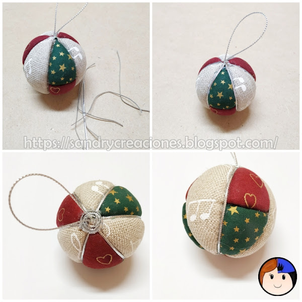 Paso 3. Últimos retoques. Como decoración nosotros hemos usado unas cintas plateadas y las hemos puesto cubriendo la unión de las partes verticales de tela. Asimismo con la misma tela hemos pegado un trozo enrollado en la parte superior de la bola, simulando la terminación de las bolas de Navidad.
