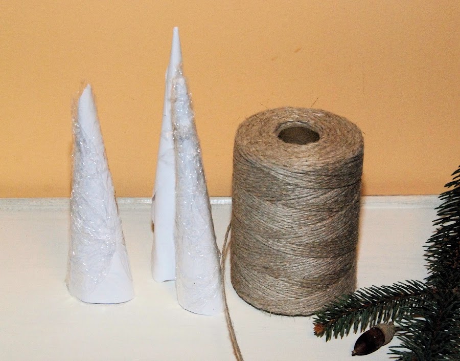 Cogemos nuestros cucuruchos ya envueltos en papel film (con esto evitaremos que nuestra cuerda se pegue al papel) y vamos enrollando nuestra cuerda alrededor.