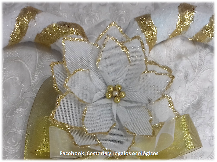 Y decorar con los elementos que tengas a mano: puede ser una flor como esta que ya anteriormente te compartí como hacerla con arpillera o yute, con esferas, con listones, etc...