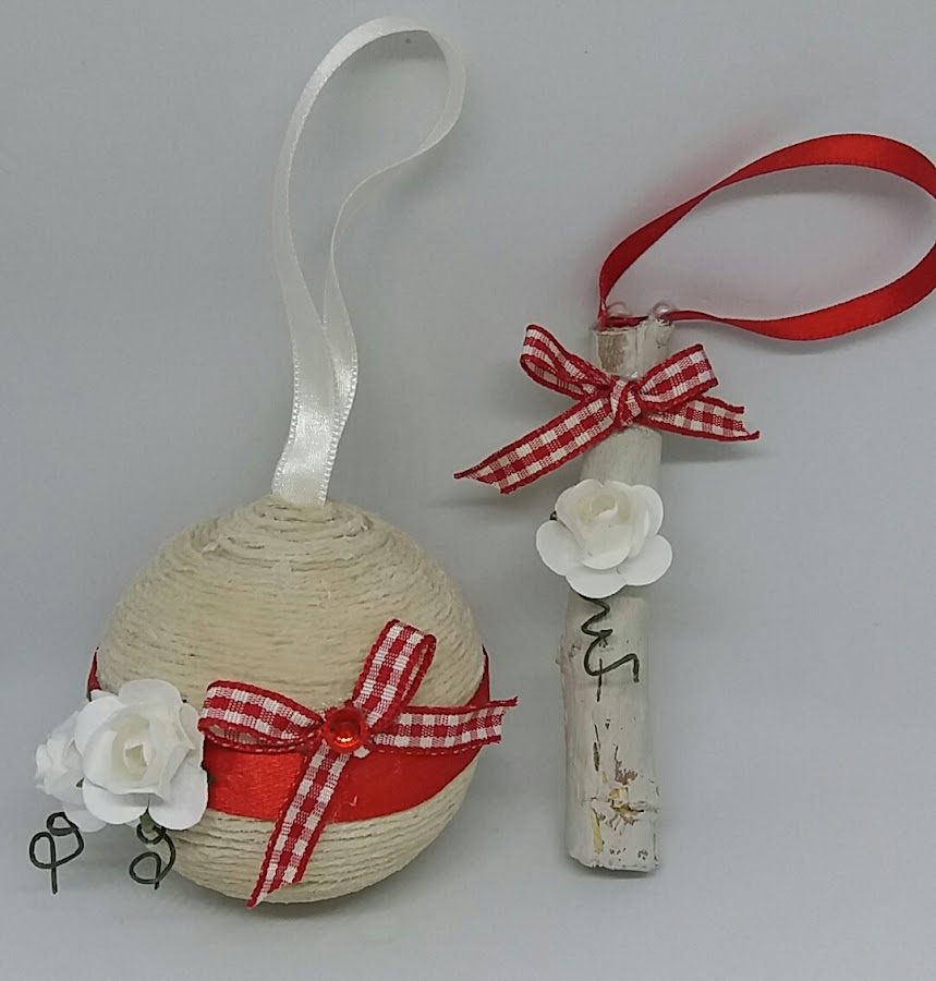 Árbol navideño, de porexpan, comprado hace varios años y unos limpiapipas de otros trabajos, así como las perlitas rojas, y los lazos de vichy rojo y blanco, eran de unas bolas de navidad, de cuando mis hijos eran pequeños.