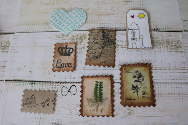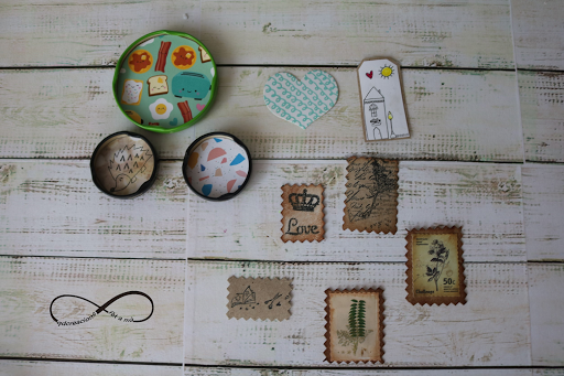 Para ello he hecho unos adornos para nuestros álbumes de scrap, con el cartón de los rollos de papel de water, tinta distress vintage, sellos y papeles de scrapbooking.