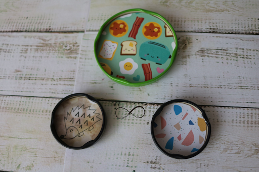 Por otro lado con diferentes tapaderas de botes de cristal, y papel decorado, podemos hacer imanes diferentes y originales para la nevera. Le darás un cambio espectacular y sobre todo diferente. Con sólo cambiar el diámetro y el papel de tus tapaderas.