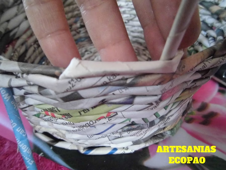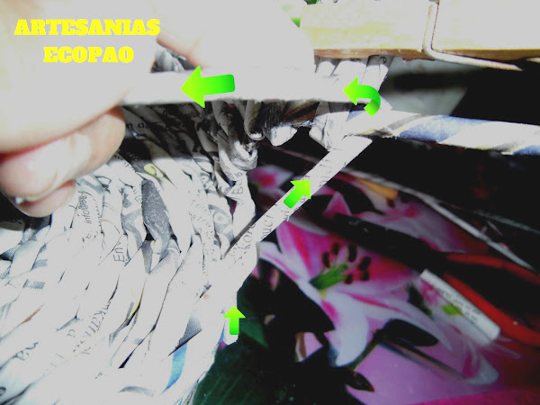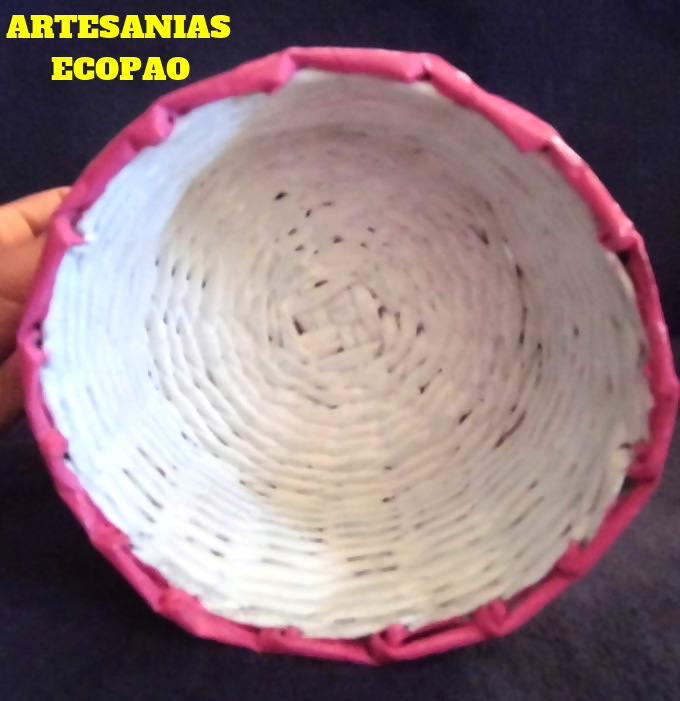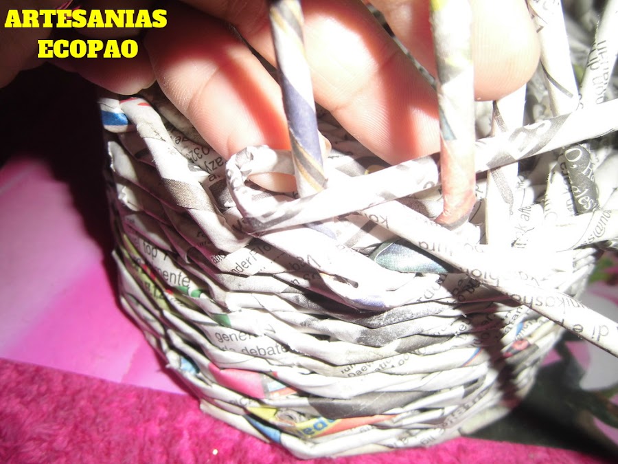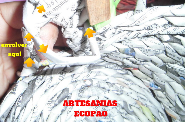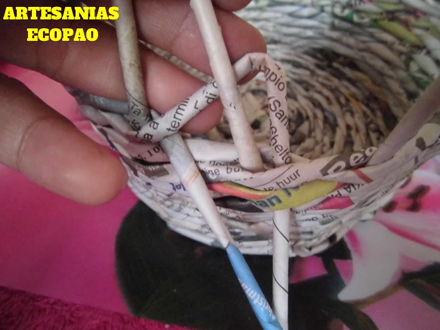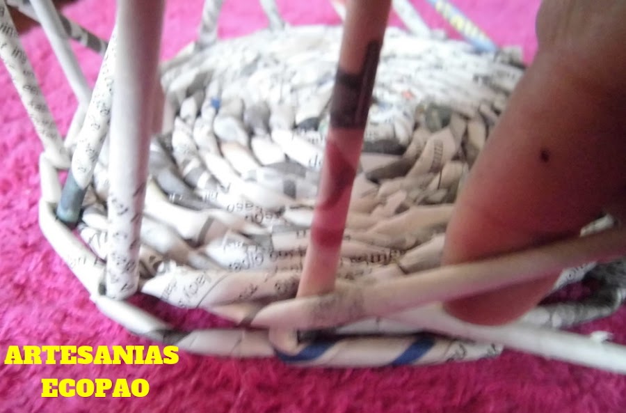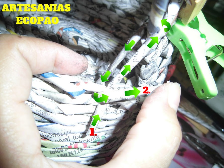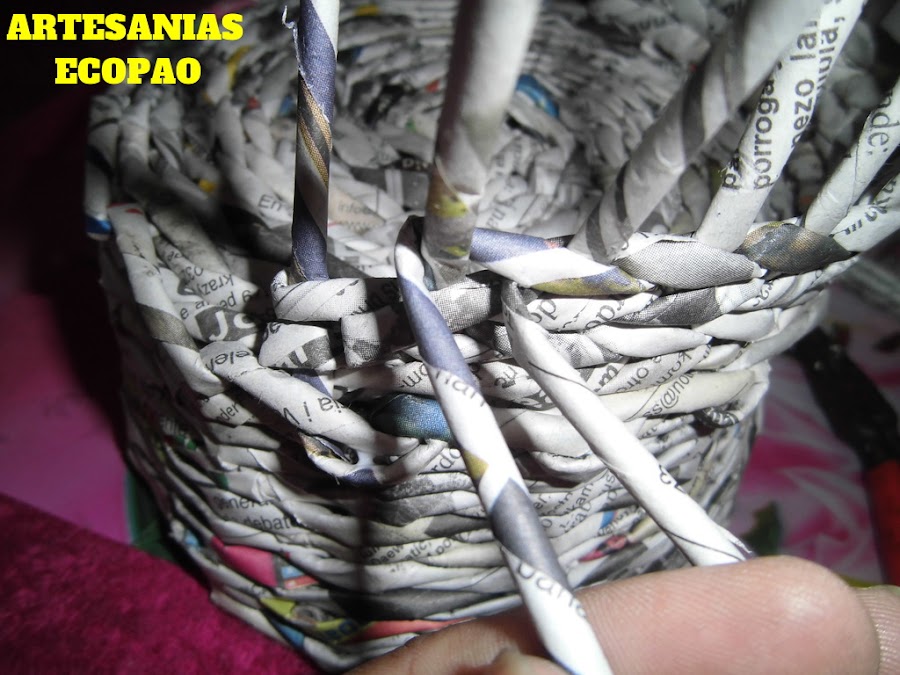 Damos la vuelta a esta pequeña cesta, e introducimos un rollito doblado a la mitad, por los orificios que dejamos del primer redoblaje que hicimos.