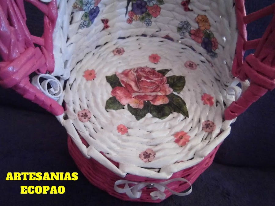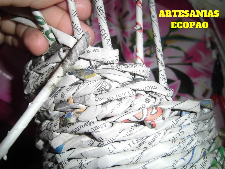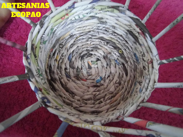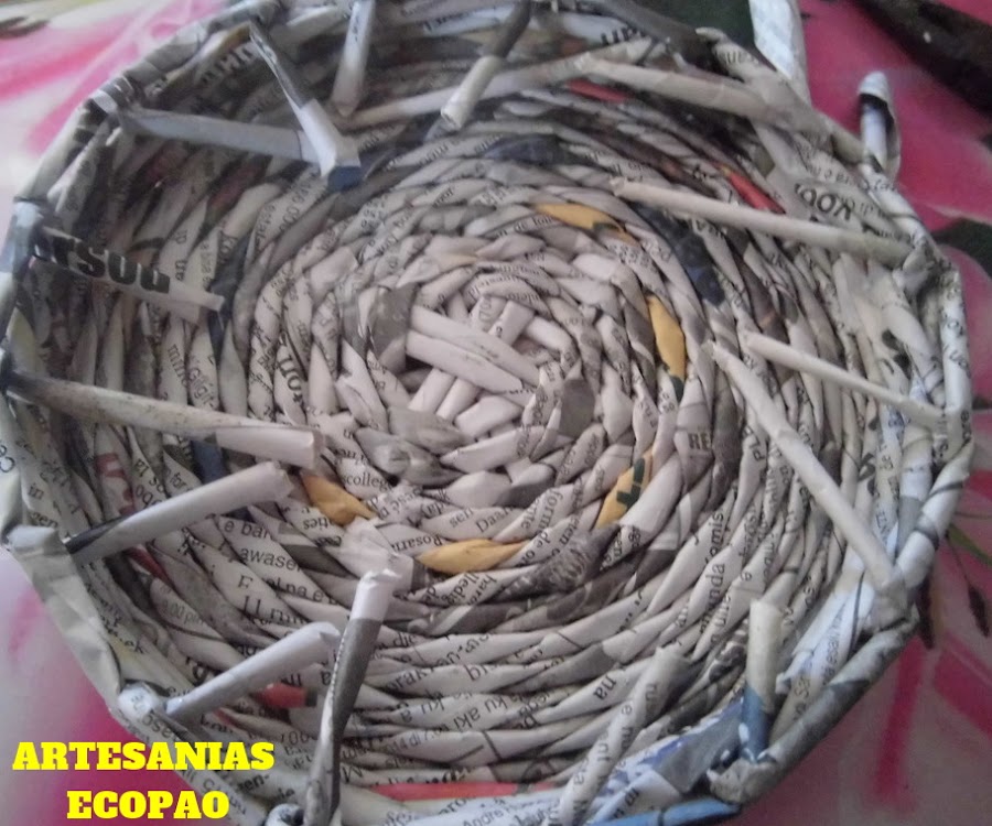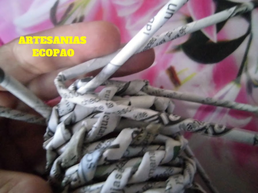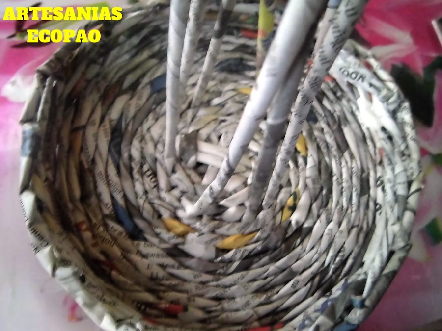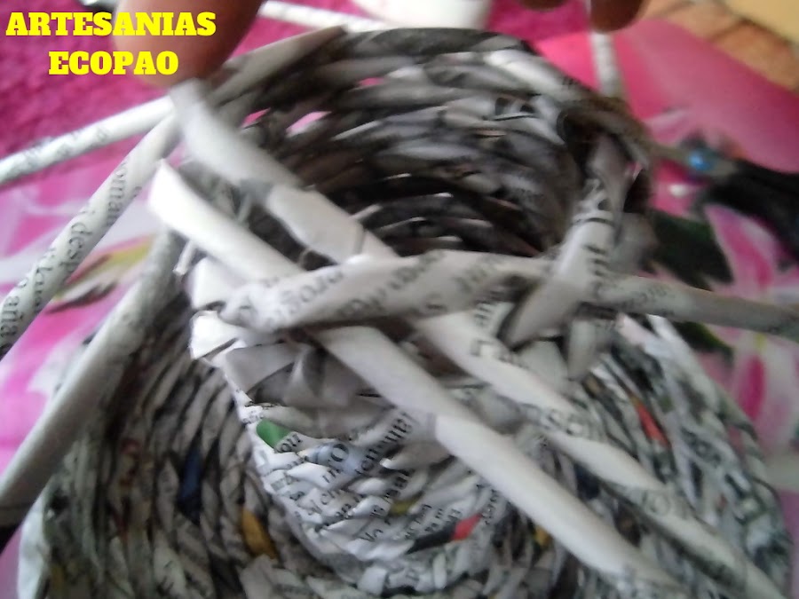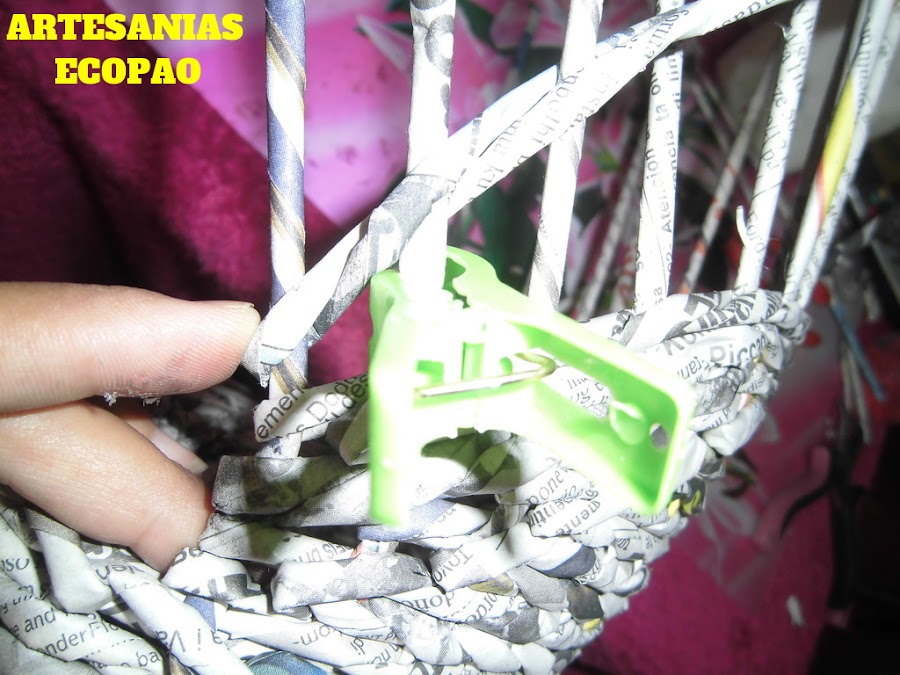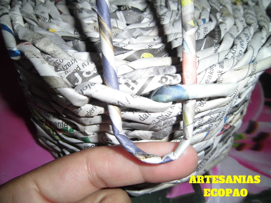 Damos la vuelta a esta pequeña cesta, e introducimos un rollito doblado a la mitad, por los orificios que dejamos del primer redoblaje que hicimos.