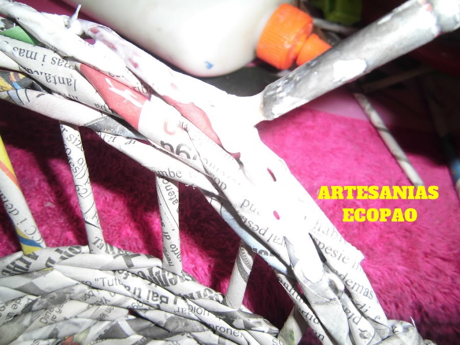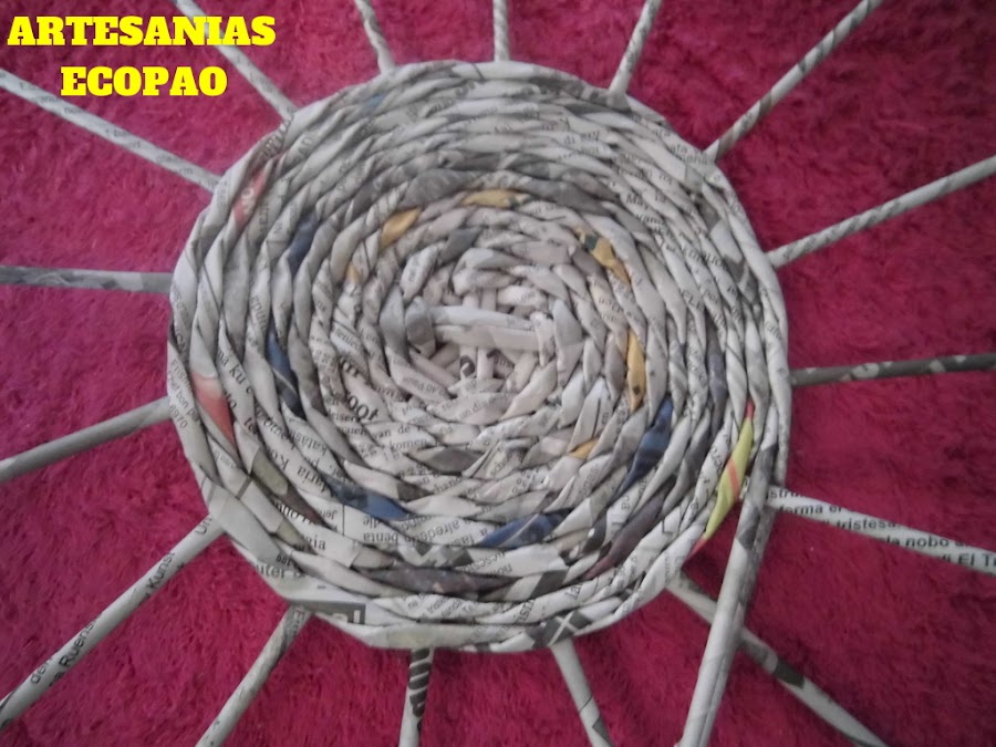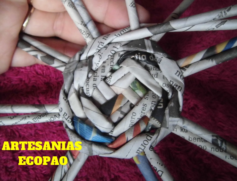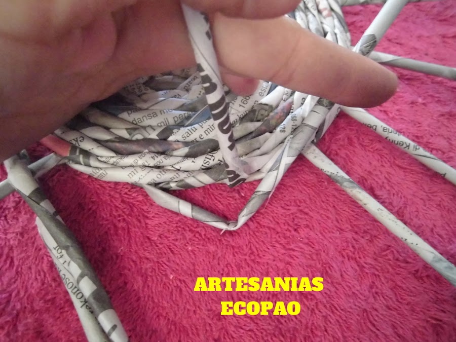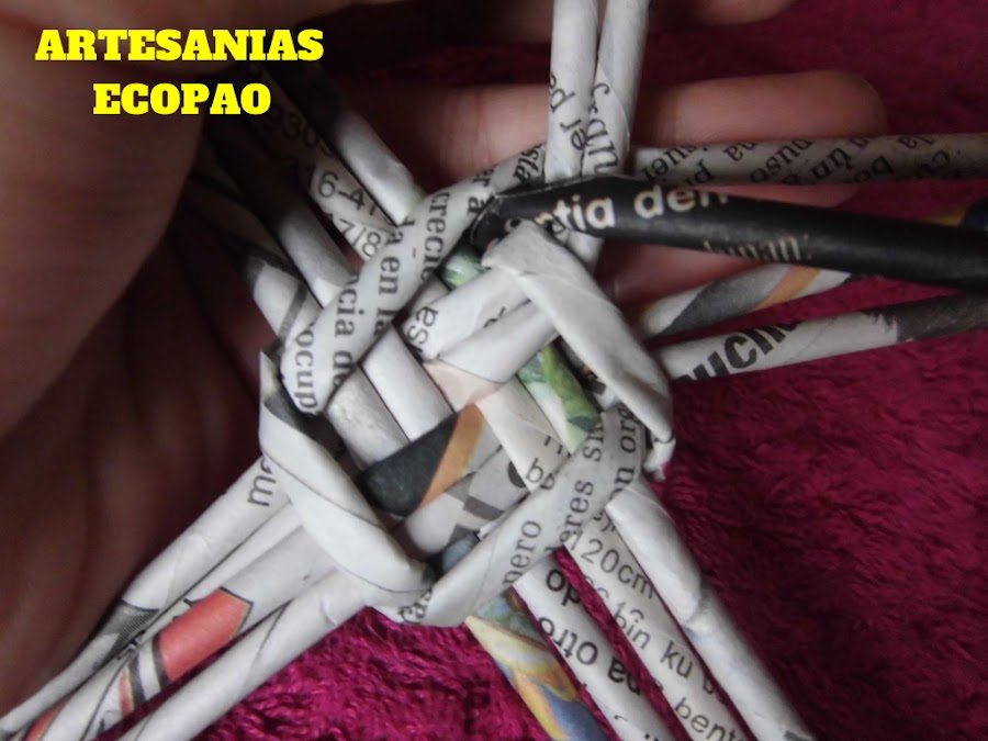 Ahora reservamos los 2 rollitos con que tejimos la base; a continuación tomamos un parante y lo pasamos al lado del siguiente, repetimos lo mismo con todos los parantes.