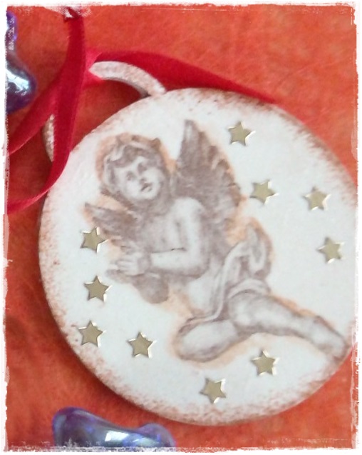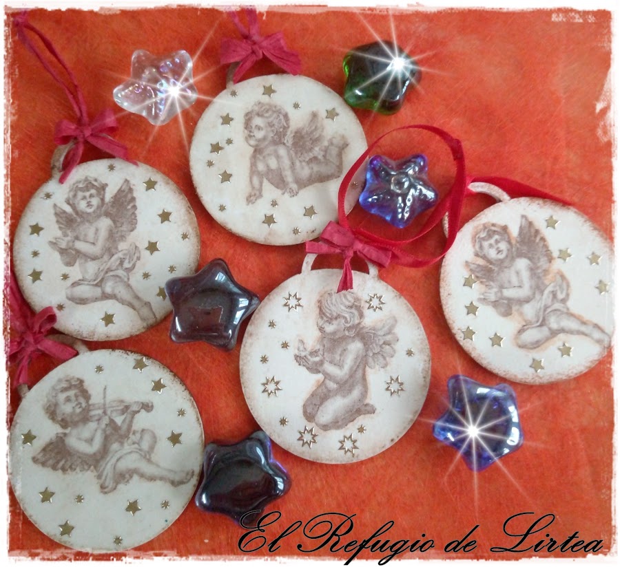 El tema que propuso es "Preparando la Navidad" y participo con estos adornos navideños. Adornos que he hecho con unos redondeles de DM ( son los mismos redondeles que utilicé para hacer los adornos con transfer (adornos navideños con transfer). En este trabajo utilizo unas imágenes muy angelicales de servilletas.
