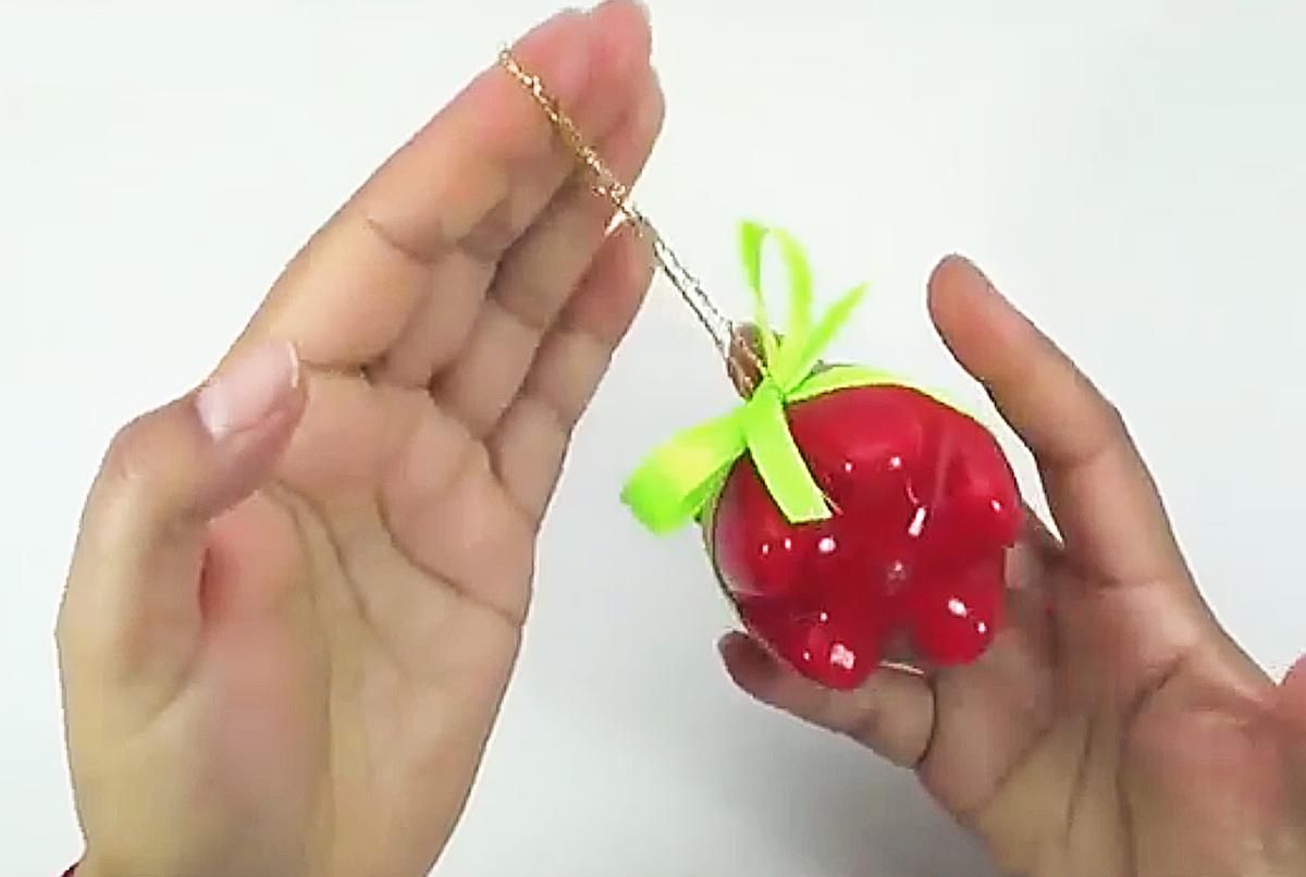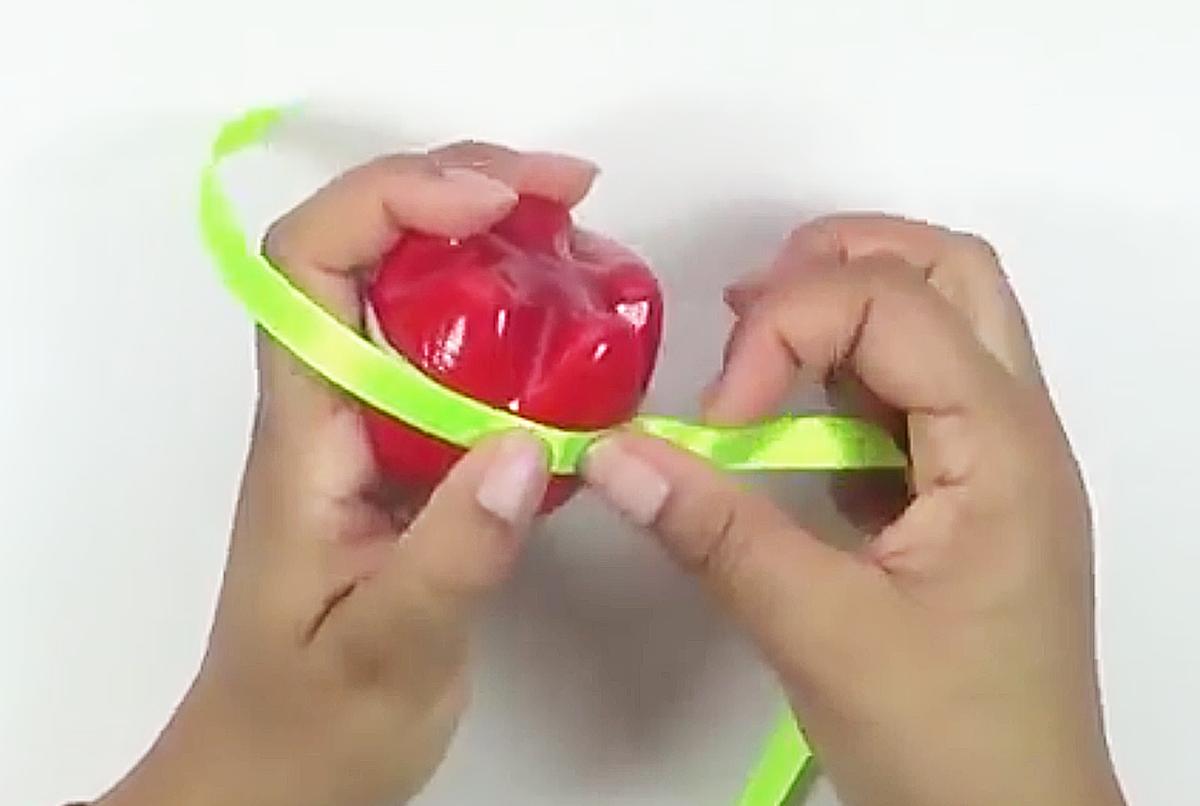 Haz un nudo con los extremos que dejaste de la cinta y coloca el hilo para colgar, finalmente haz un lazo para asegurar el hilo y decorar tu adorno.