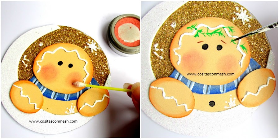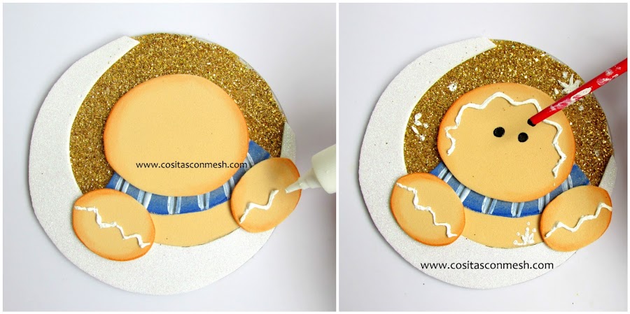 7.-Ahora con pintura de relieve color blanco, pongo lineas en las manos y cabeza, los ojos los pinto de negro usando la cabeza de un pincel, para que asi quede redondito y chiquito su ojito.