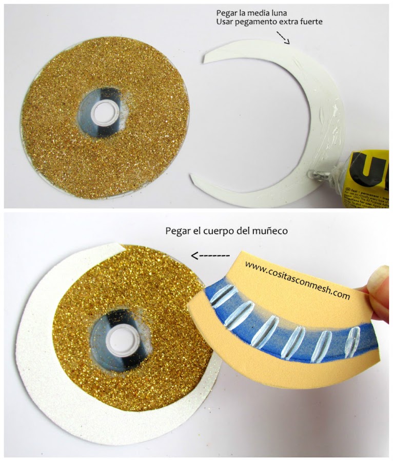** Recicla tus cds, decoralo con brillantina o con foami, yo lo que hice fue aplicar pegamento blanco con los dedos, luego rocie diamantina dorada, deje secar por unos minutos.