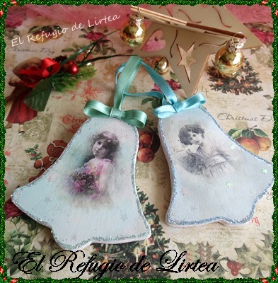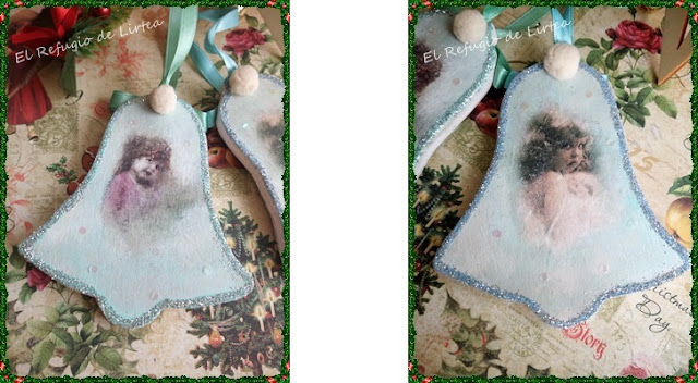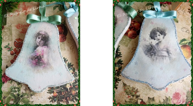 Como una de las técnicas que más me gusta es el decoupage, me decidí por hacerme unos adornos navideños con forma de campanas y unas imágenes muy angelicales para realizar el decoupage.