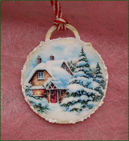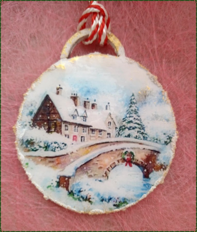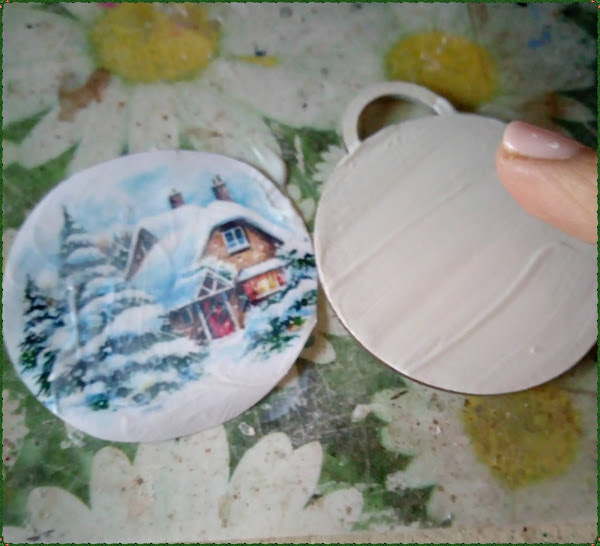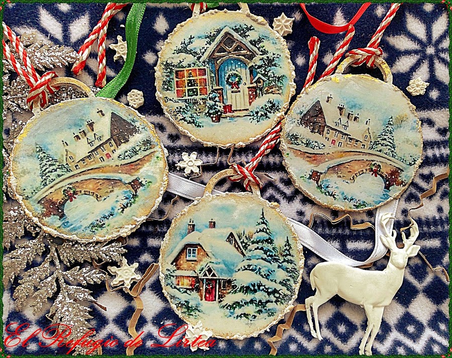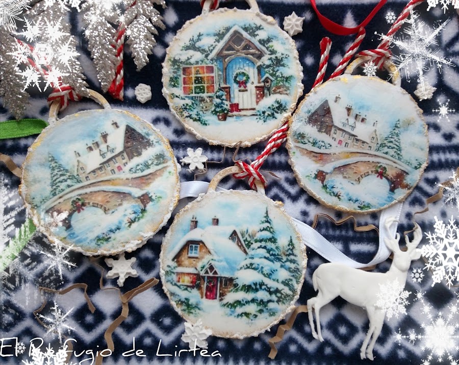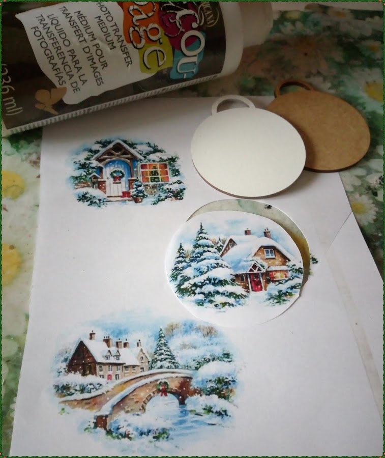 Ysnelda eligió los colores navideños por excelencia , Rojo, Verde, Blanco. He decorado unos redondeles de contrachapado con la técnica de la transferencia de imágenes ( transfer). He utilizado con unas imágenes de paisajes navideños en las que predominan esos tres colores.
