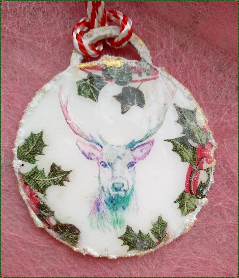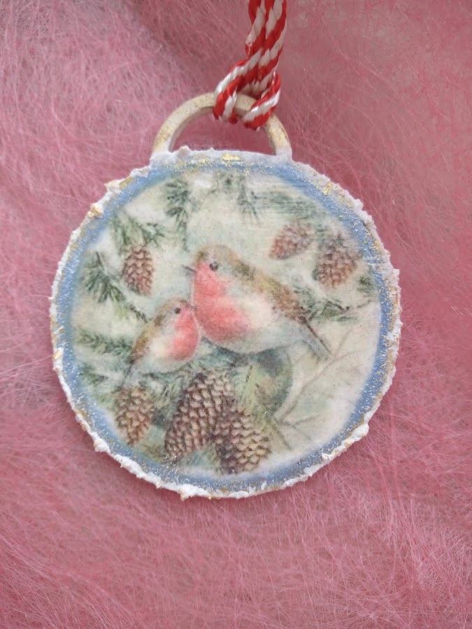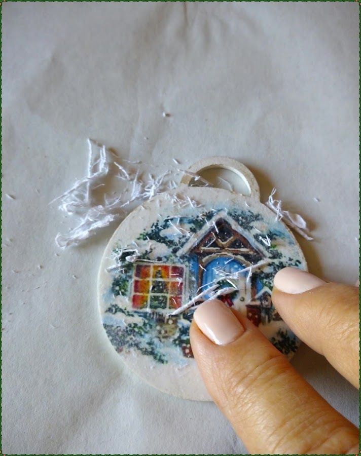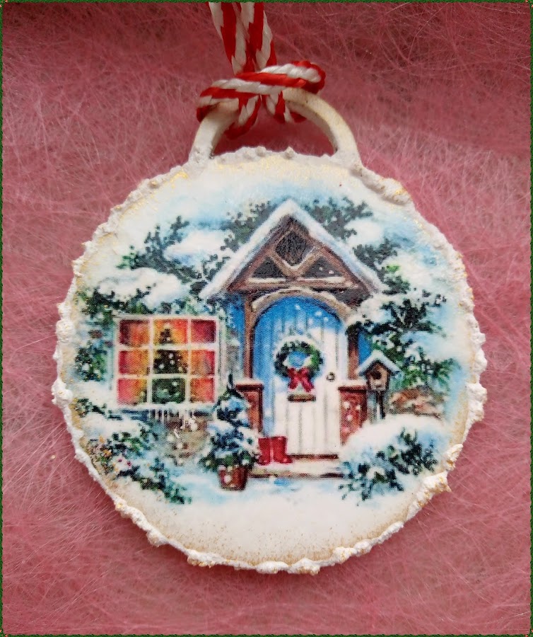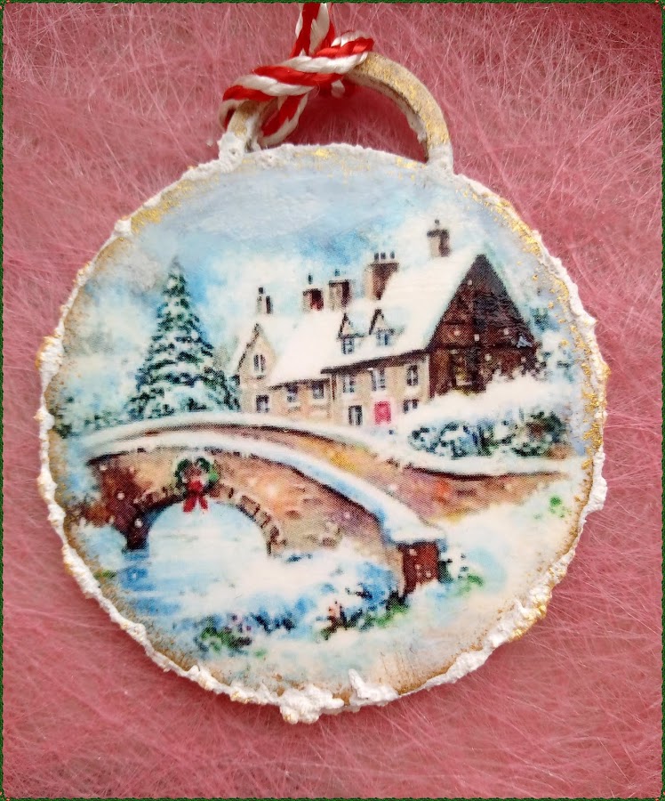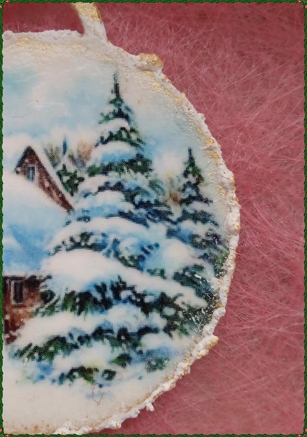 Cuando el medium secó, apliqué una capa de barniz ultra brillante, concretamente un barniz cerámico para darle un brillo extra.Tambien puse todo alrededor un poco de pasta de "nieve" y unos toques con pátina dorada para darle aún más aspecto navideño.