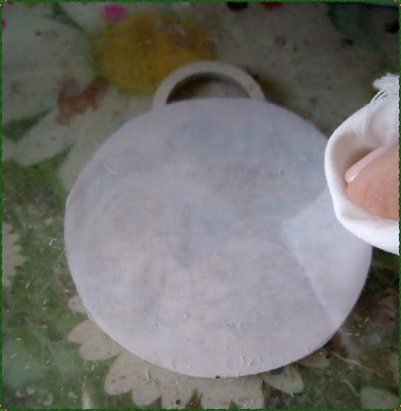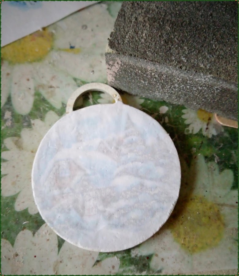 Luego aplico el médium tanto en el redondel como en la imágen. Lo hago con los dedos o con un pincel.