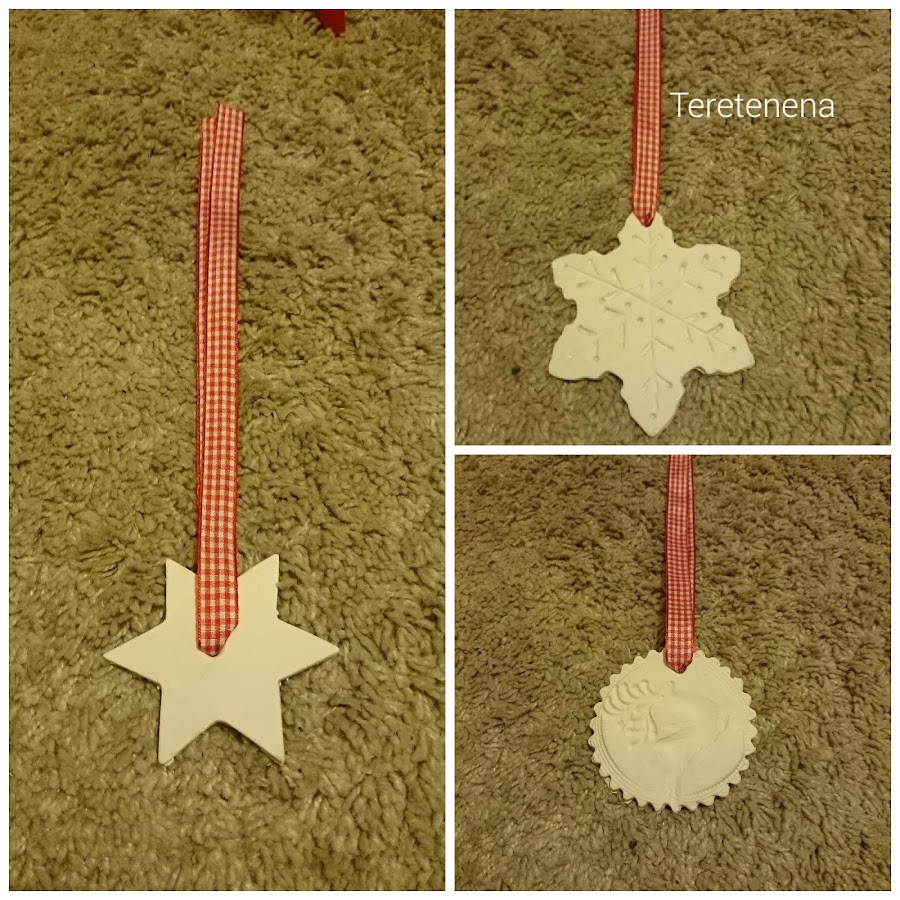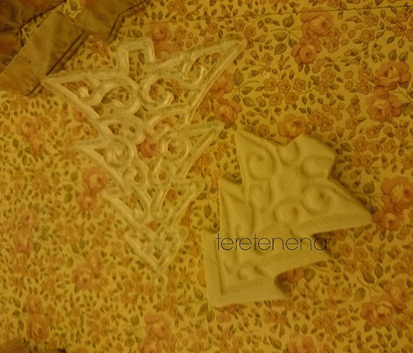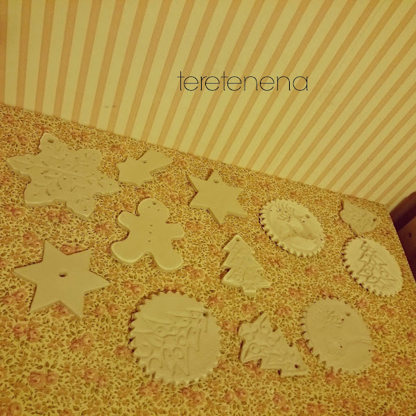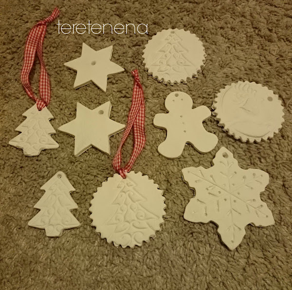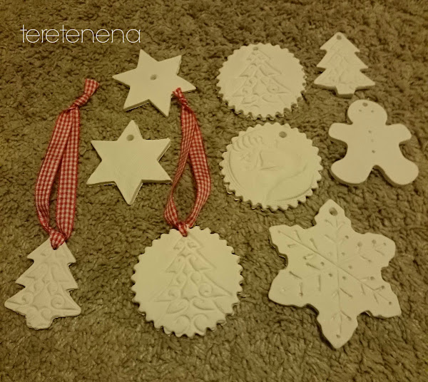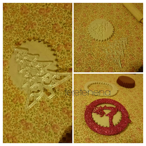 Pues bien, necesitamos arcilla blanca, un rodillo, moldes con formas navideñas (yo utilicé los cortapastas para hacer galletas) y algún objeto que tenga relieve para marcar en la arcilla. En mi caso empleé adornos, pelín cutres, pero que me sirvieron para mucho.