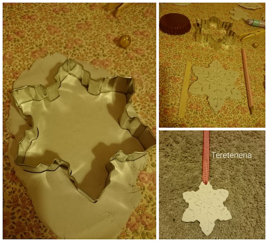 Una vez obtenida la figura, marcamos con el objeto cuya silueta queremos grabar en la arcilla. O podemos hacer dibujos, como hice en el copo de nieve con un palo de polo y un lápiz. Cualquier cosa nos puede servir!!