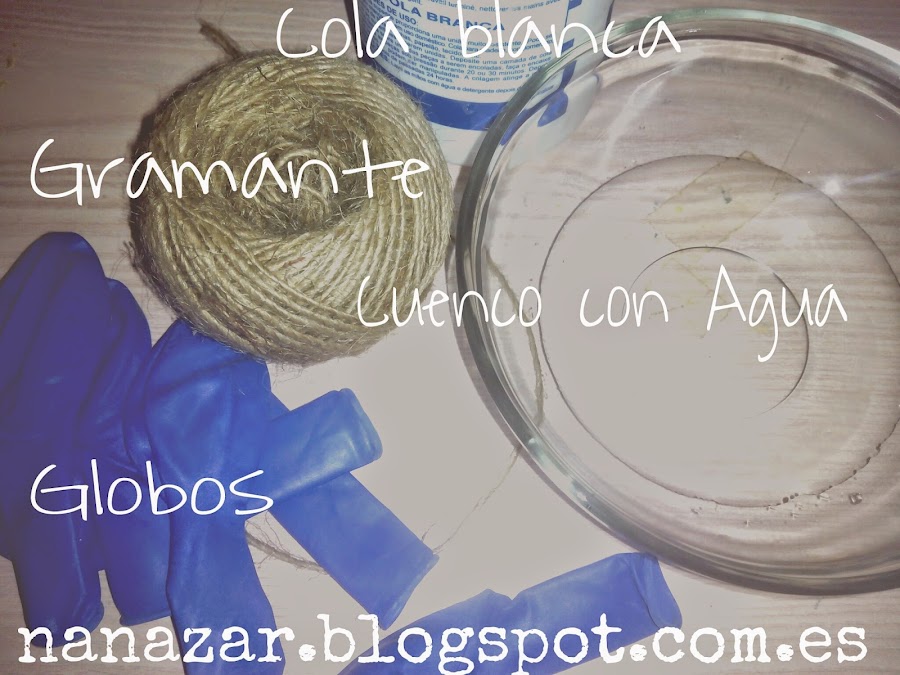 Utilizaremos el mismo método que ya hemos visto en este blog con la cola blanca. En mi caso utilizo gramante, aunque es mejor algún hilo 100% algodón para que absorba mejor la mezcla. Y globos de un diámetro menor de 23 cm.