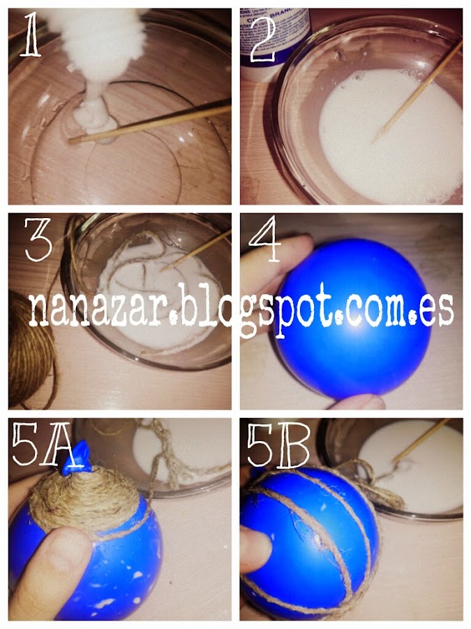 Inflaremos un globo a la medida que lo queramos (4) y pasaremos el gramante por la mezcla de cola blanca y agua (1,2 y 3) y lo vamos enrollando como queramos. Decidí hacer dos estilos (5A y 5B) Esperamos a que se seque de 1 a 2 días y después pincharemos el globo, sacaremos los restos y decoraremos la bola como queramos.