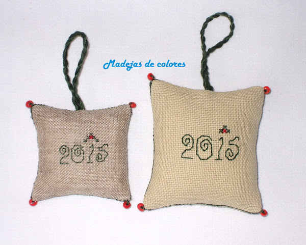En la trasera, para que quedara constancia como recuerdo, el año con unos simpáticos números. Para su montaje utilicé los dos colores principales, verde para coserlo y colgarlo y rojo en las bolas de las esquinas.