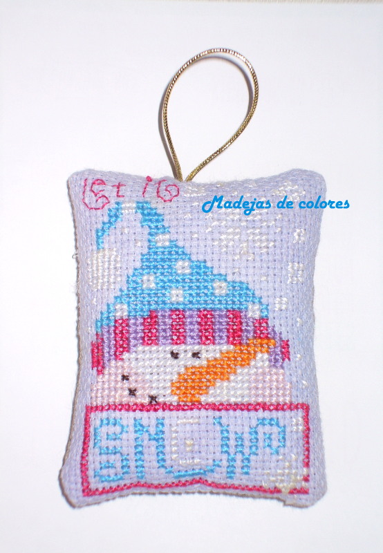 Y por último otro muñeco de nieves, con la particularidad, que la tela la teñí yo misma, para darle ese tono celeste lavanda y resaltara el blanco del muñeco y los copos de nieve.