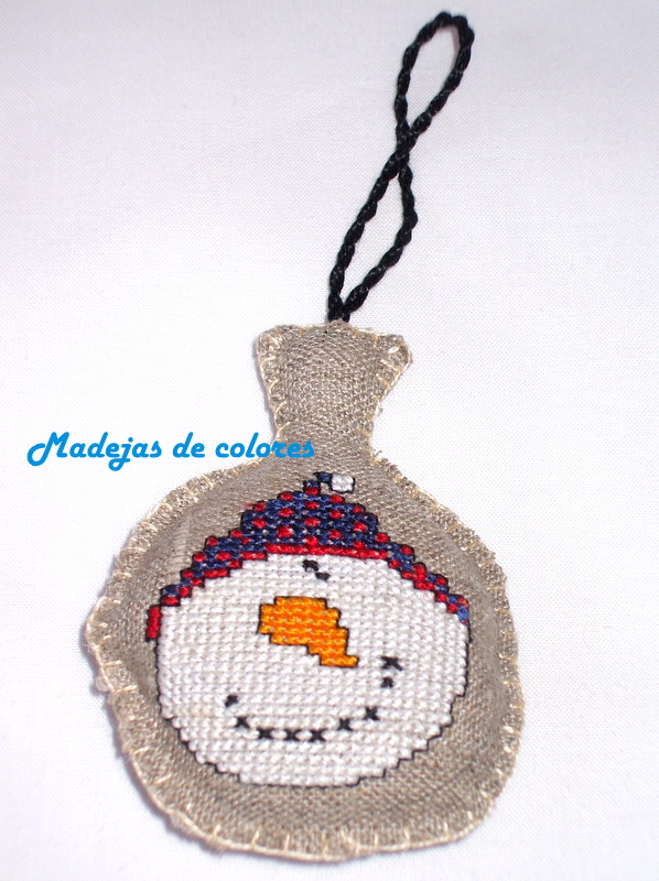En un lino rústico, bordé la cabeza de un muñeco de nieve. Pensé que me iba a resultar menos complicado, que el anterior, al tener algunas hebras más gruesas, pero me equivoqué, algunas eran tan finas, que en lugar de 2 cogía 3, así que tuve que desbaratar varias veces.