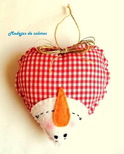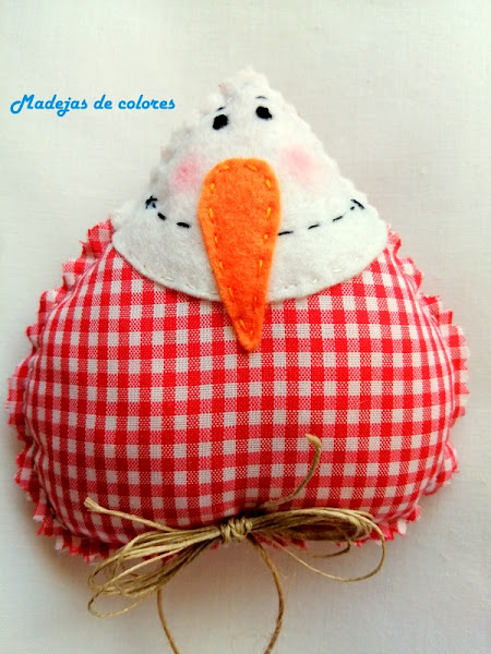 Con un simpático muñeco de nieves boca abajo, sobre tela de vichy e hilo de carreto.