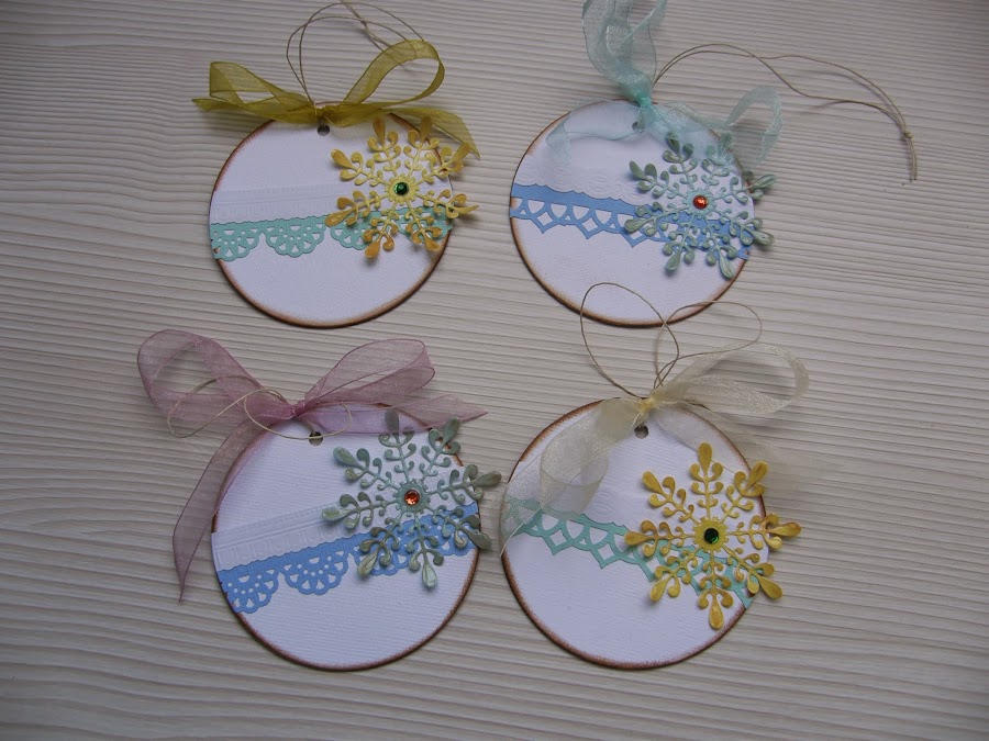 Se trata de un circulo de cartón forrado con papel blanco por los dos lados, tinta disstres en los bordes, una tira de papel de papel troquelado yu na tira de papel imitación puntilla. Como toque navideño un copo de nieve troquelado con un brillantito en el centro y para darle fuerza le puse glossy, para colgarlo una cuerdita sencilla y un lazo sencillo.