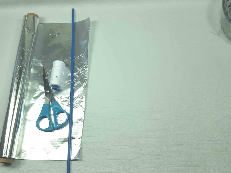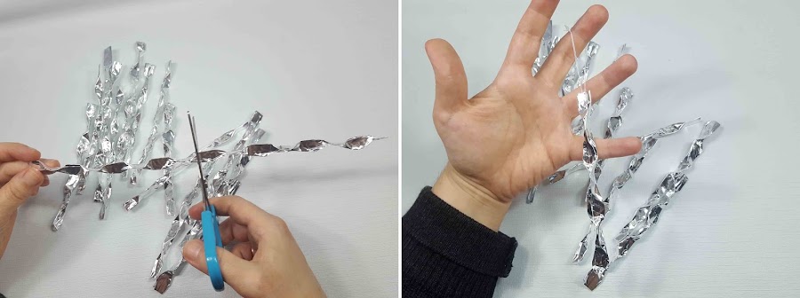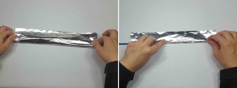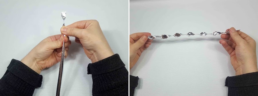 Empezaremos cortando una tira un poquito ancha de papel de plata. Doblamos el papel a la mitad y lo enrollamos con la ayuda de la varita.