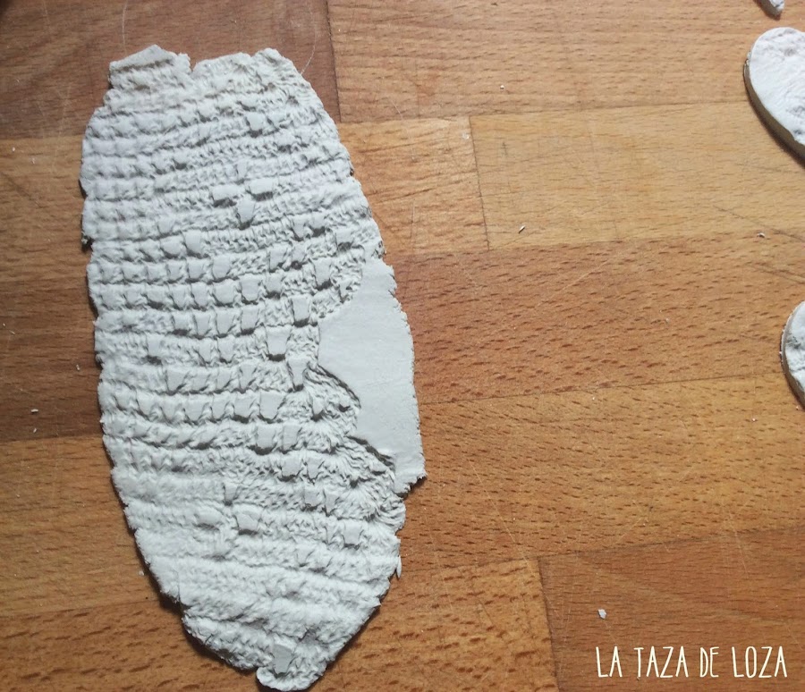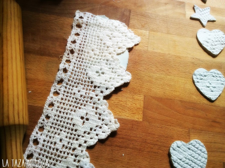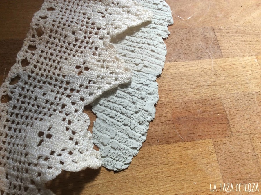Paso 2: Se pone un trozo de puntilla, o de tejido de dos agujas, o alguna cosa que tengamos por casa, que nos sirva para hacer los relieves a los adornos. No mancha, con lo cual no pasa nada.