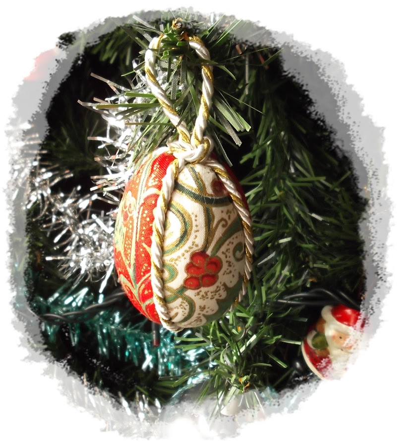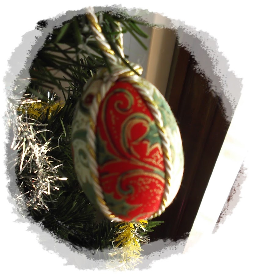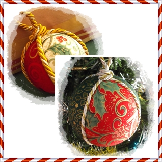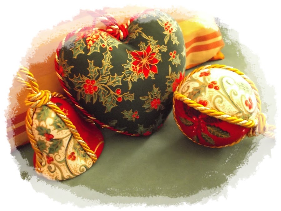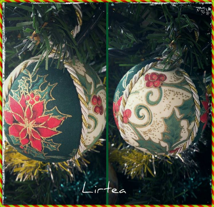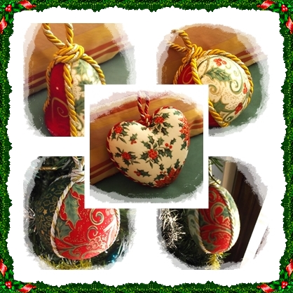 Son figuras de porex o poliespam( pueden ser, bolas, corazones, estrellas campanas, etc)que estan cubiertos con telas, en este caso, con estampados típicos navideños.