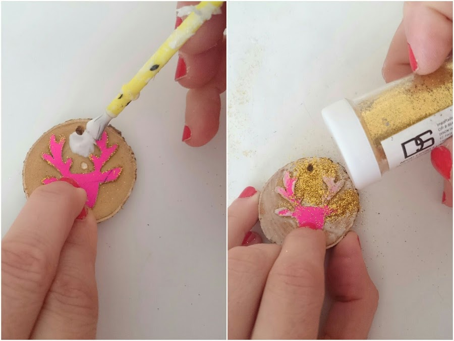 Colocaremos la plantilla sobre la rodajita de madera y le aplicaremos cola blanca de carpintero, con un pincel, una vez hecho esto y sin retirar la plantilla, hecharemos por encima purpurina, yo lo hice con el bote directamente, ya que viene con un aplicador con unos orificios (tipo salero), retiraremos cuidadosamente la plantilla y dejaremos secar hasta el dia siguiente.