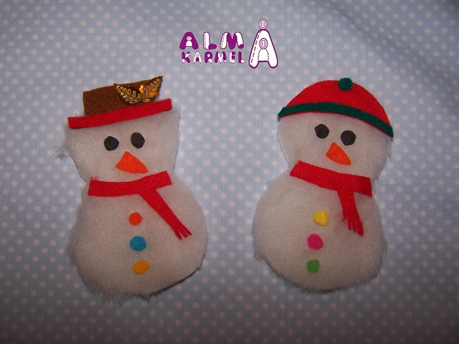 Y por supuesto, algo que les encanta hacer a los niños y que en unas Navidades nevadas no puede faltar, el muñeco de nieve, y aquí tenéis mi versión, dos modelos diferentes pero igual de simpáticos, realizados en tela de peluche, ¿cuál os gusta más?