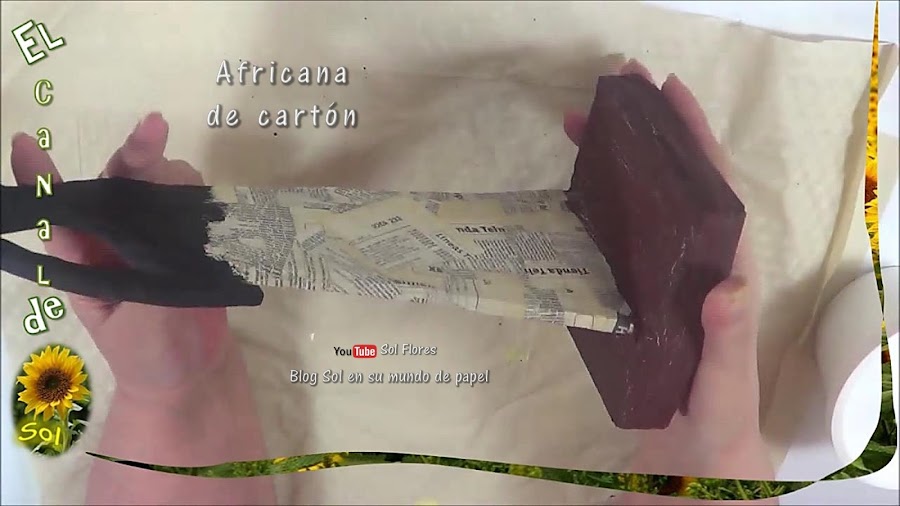 y con trozos de papel, yo voy a usar hojas de directorio telefónico, le damos dos capas de cartapesta, empezando por la parte inferior, ya bien seca, yo combiné pintura negra y café, pintamos la parte del cuerpo que quedará descubierta, le di tres manos de pintura y en la parte de abajo le di solo una mano de pintura café