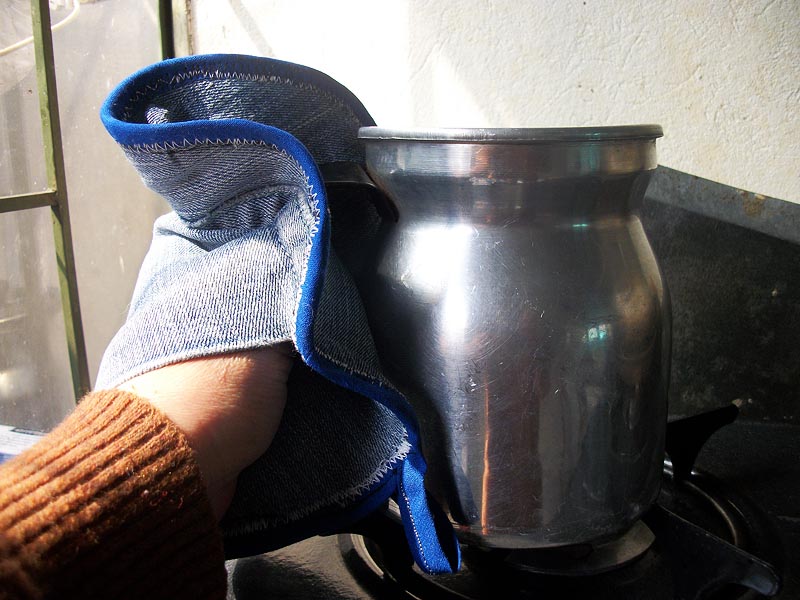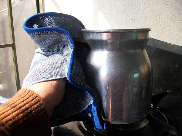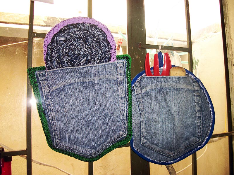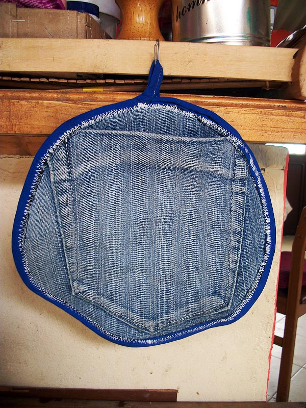 Simplemente cortamos el bolsillo, redondo o cuadrado, para atrás otra pieza igual de denim sin bolsillo, y para el relleno podemos usar tela de franela o alguna tela mullida, unimos con alfileres las piezas y les pasamos costura, después le ponemos un borde, le hacemos la agarradera y listo! un toque original para la cocina y para salvar manteles y manos de las quemaduras.