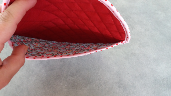 Y colocamos esta pieza encima de la principal, cosiendo por la parte inferior hasta la altura del bies, quedándo de esta manera: