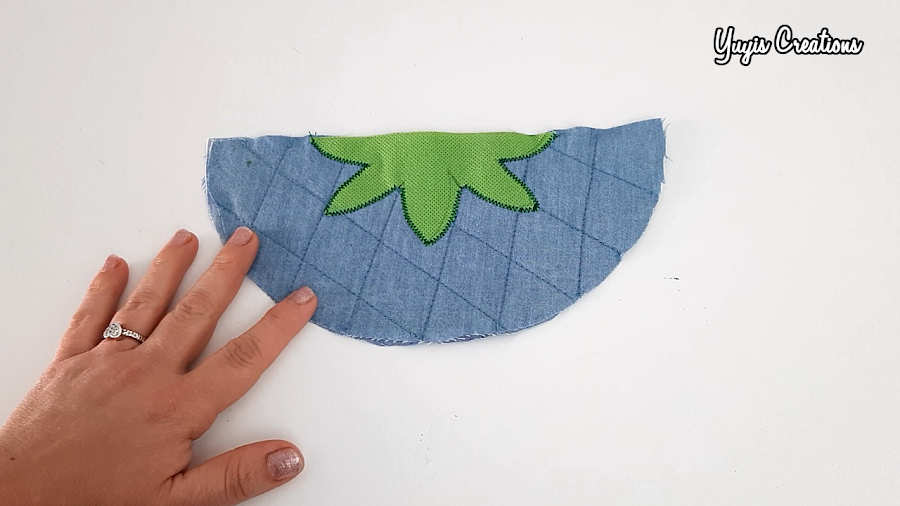 Hecho esto, ponemos la otra pieza de tela encima (por la parte del revés de la pieza que tiene las hojas), y con el derecho a la vista, sujetamos y cosemos por las marcas que hemos hecho.