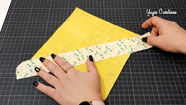 Vamos a empezar por marcar una línea en diagonal en nuestra pieza de bayeta, esto nos servirá de guía para que la primera tira que coloquemos no nos quede torcida. Sobre esa línea colocamos la primera tira de tela con el derecho a la vista. Es muy importante que la tira sobresalga de la bayeta por los lados, así como ves en la imagen de abajo.