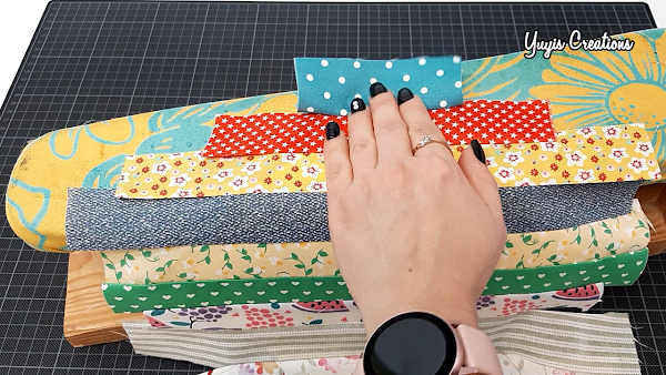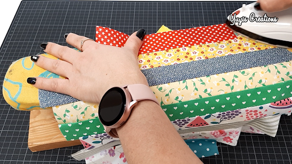 Una vez cosida la pieza, la abrimos para ponerla del derecho y planchamos. Ahora sobre la tela que acabamos de coser, colocamos otra tira, también enfrentando los derechos, así;