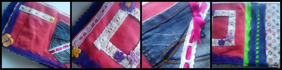 En primer lugar tenéis la portada de la Agenda y abajo detalles del lateral y la parte trasera. A continuación os propongo un paseo por le interior de esta agenda cómo si fuésemos pasando página a página. Ahora os la encontraréis vacía pero imaginárosla con vuestras tarjetas en los numerosos bolsillos, pos-it, calendarios y notas en las perchas-clips, con vuestros bolígrafos, fotos o mini cuardeno ( en el lugar destinado a ello junto al bolsillo vaquero) y con todo lo que queráis poner.