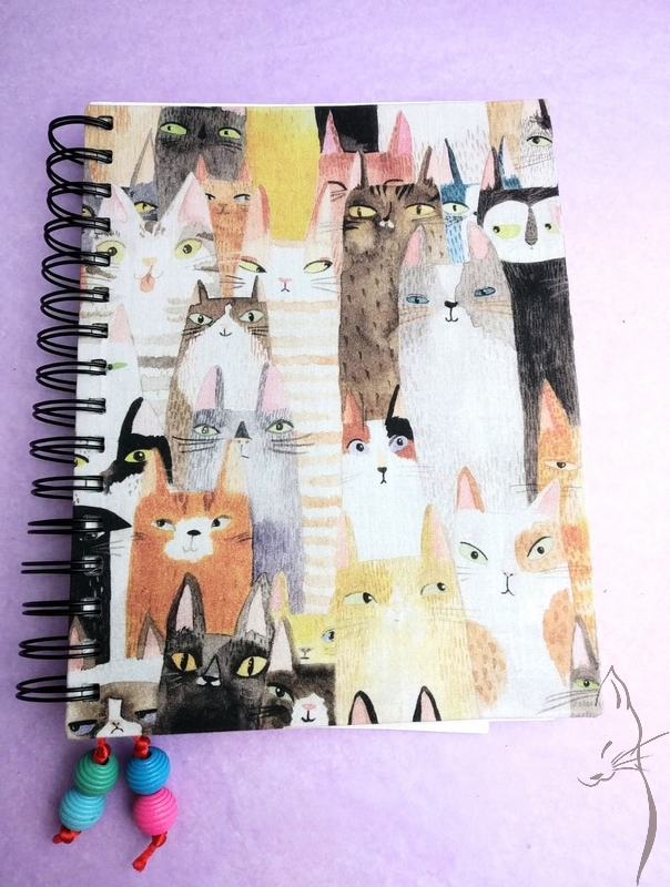 La tela para la tapa frontal, un algodón con estampado de gatitos, de Ribes i Casals, que además pronto la veréis en otros proyectos.