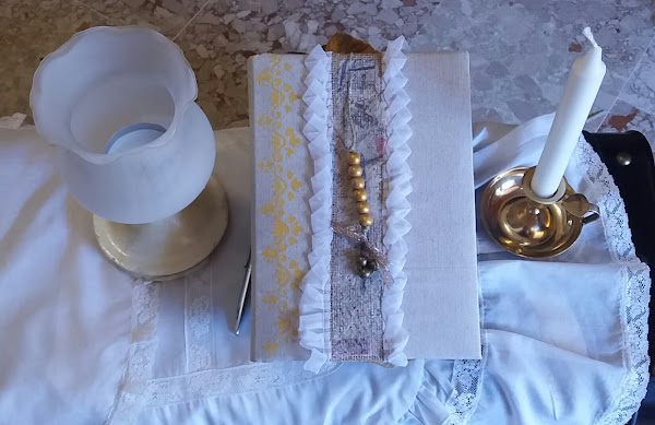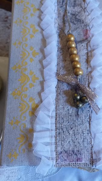 Comencé poniendo esta tela de arpillera con tul y con una servilleta que me regaló mi amiga Amparo, ideal para la ocasión , en el centro lleva dibujada una pluma, bien podía ser la de un famoso poeta!!!!