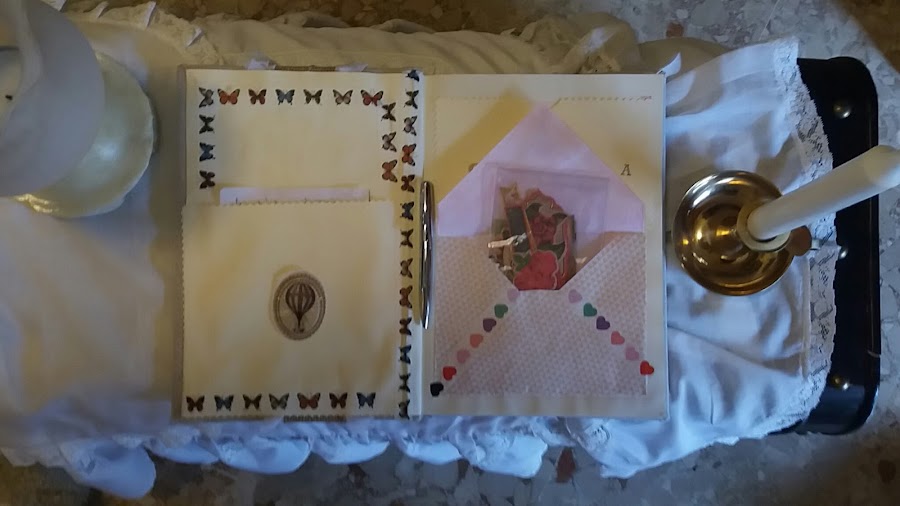 Finalmente en sus primeras páginas, y aprovechando también para que no se vean las telas, las decore con washi tape, hice un apartado para meter cosas, recetas, tarjetas notas ete..... y en la hoja derecha un sobre hecho por mí, también con washi tape de corazones y dentro metí unas chuches de scrap.