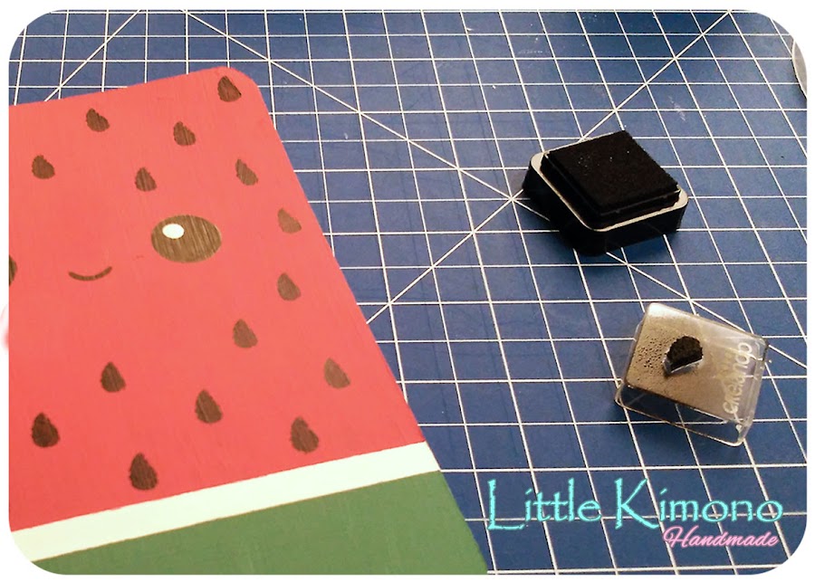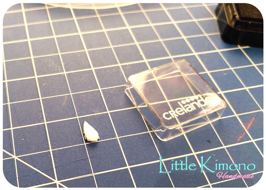 6. Llega el momento de las pepitas^^ para ellas crearemos un sello, cortamos una "lágrima" en el retal de goma Eva toalla y pegamos con cinta doble cara sobre la tapa de la almohadilla de tinta y a estampar!^^