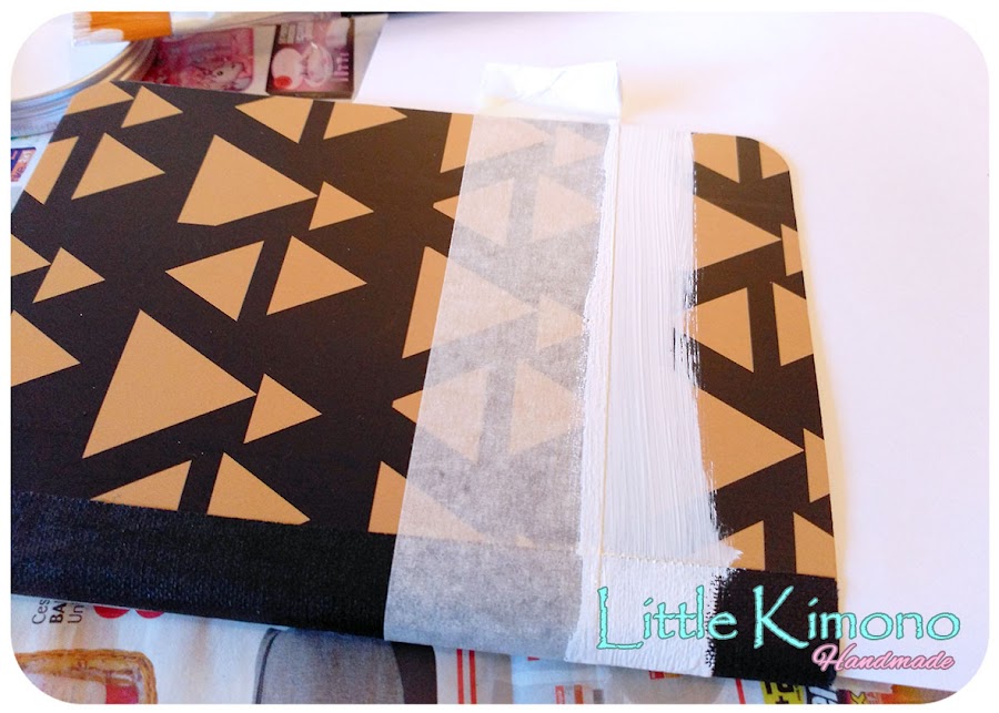 Paso a paso: 1. Colocamos una tira de cinta de carrocero en horizontal en la parte inferior y con una brocha pintamos de blanco. Dejamos secar y retiramos la cinta.