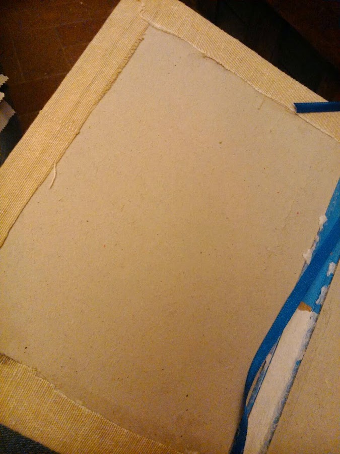 Al desencolarla y forrar de nuevo la tapa queda como la foto. Para tapar estos bordes he usado papel de embalaje grueso y también he recortado un trozo del tamaño de las hojas para usarlo de primera página.