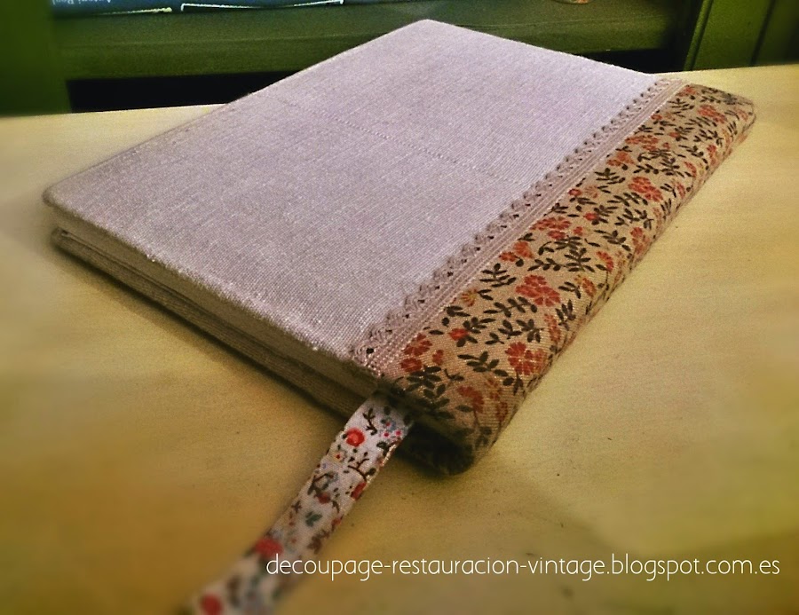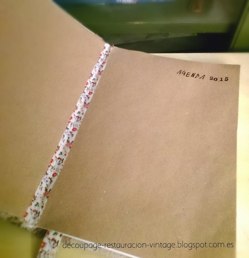 La agenda es de tapa dura y hay que desencolarla entera para forrarla de nuevo usando pegamento, yo he usado cola blanca. La parte de dentro de la tapa podéis poner un papel que os guste o también usar tela. Para el lomo he usado una tela de flores pequeñas y con cinta he tapado las uniones.
