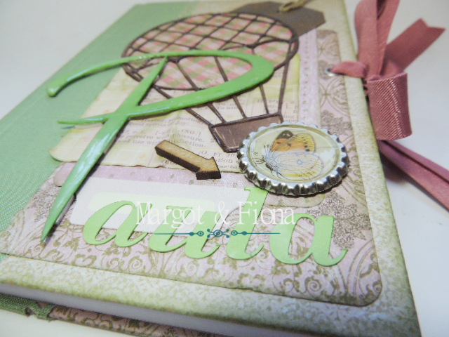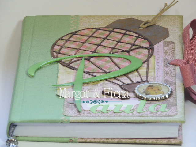 En esta ocasión es un dietario para Paula, en tonos verdes y rosas y con un cierto aire vintage, con el globo aerostático y su inicial gigante.