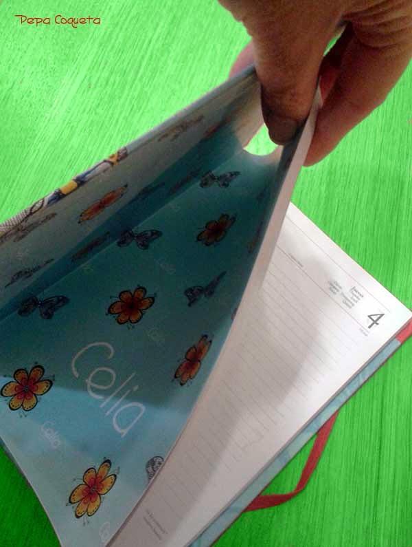 Por supuesto van las guardas personalizadas y como véis, por dentro con mucho espacio para escribir todos nuestros compromisos. Va hoja por día, el interior es una agenda clásisca. Lomo y esquinas en tela de encuadernar buckram. Lleva una goma para que se cierre y no se "escape" nada. Y por detrás es igual de bonita!
