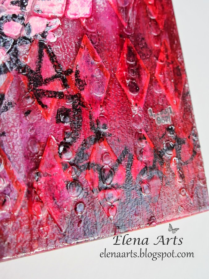 Y la cuarta es también inspirada en "Alicia en el país de las maravillas", lleva incorporados un trocito de tela con motivos de rombos y otro rojo, una pieza de metal de Tim Holtz, mucha textura y color. Sin embargo, he procurado hacer los elementos bastante planos para que al llevar la agenda en el bolso, sea cómodo y práctico. está todo cubierto con un médium protector así que será duradero!
