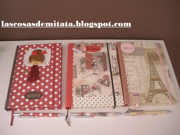 Las tres llevan bolígrafo a juego, sus nombres, marcapáginas en lazo y cierre en goma.