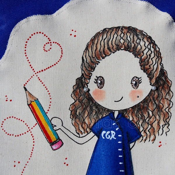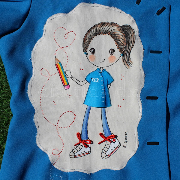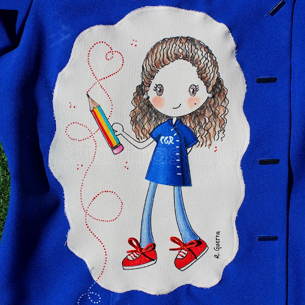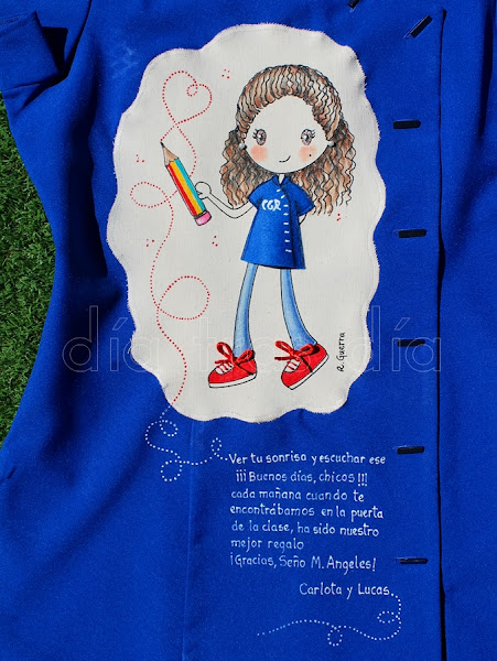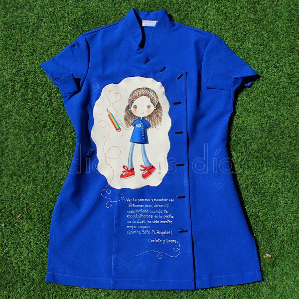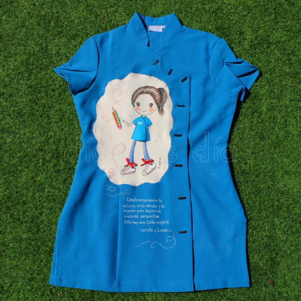 Fue todo un poco loco, ya que quedaban muy pocos días para que Estrella se trasladase de ciudad, así que nos tuvimos que poner las pilas. Ella quería regalar a las maestras unas batas decoradas con el dibujo de Ro-ro maestra, así que ella misma se encargó de buscar las batas y de hacérmelas llegar para que me pusiera manos a la obra cuanto antes.